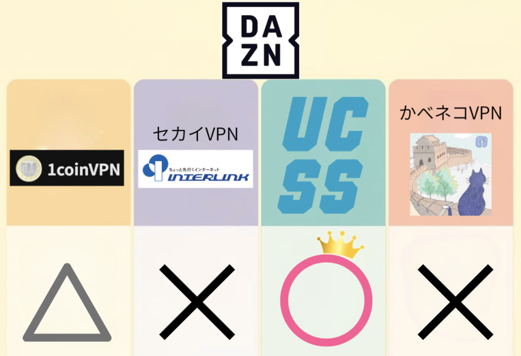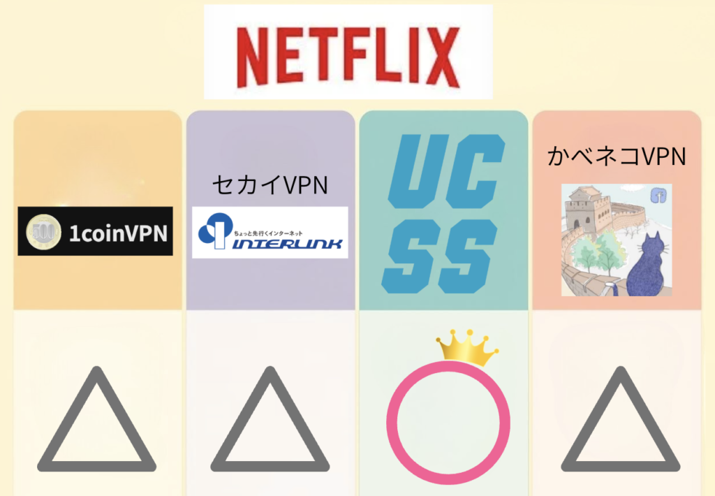 1coinVPN: iOS版では非対応のため、多くの方が使いたいiPhoneやiPadで使えないため△になっています。