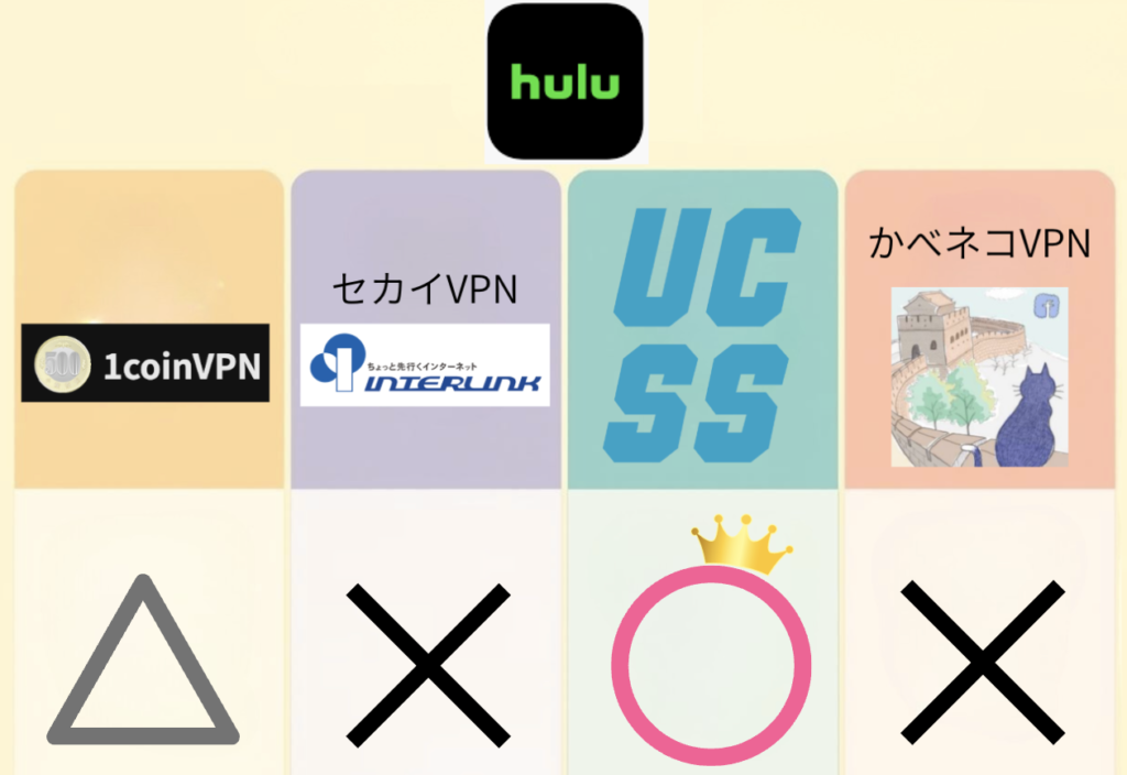 セカイVPN: 通信プロトコルの古さから接続自体が難しく、Hulu側からブロックされ再生まで辿り着けないことが大半です。