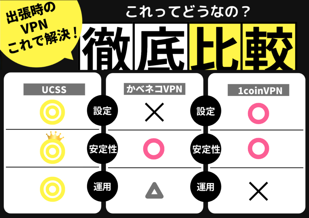 管理人としての判断:かべネコVPNは「設定に慣れた人の選択肢」、1coinVPNは「用途が軽い人のコスパ選択肢」。そして、安心、安全、仕事の安定を優先するなら、結局UCSSが一番バランスが良い——これが管理人の結論です。