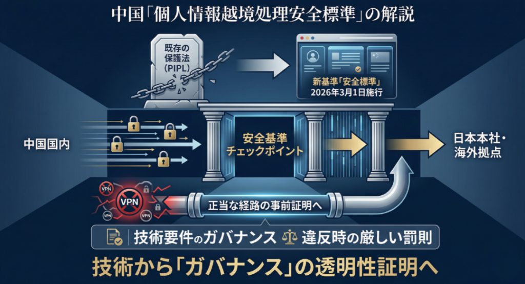 この新基準は、2026年3月1日に本格施行されました。一言でいえば、「中国国内で収集した個人情報を海外(日本を含む)に送信・共有する際の、具体的な『作法』と『技術要件』」をガチガチに固めたものです。これまで「なんとなく」で許されていた行為が、すべて法的なチェック対象になります。