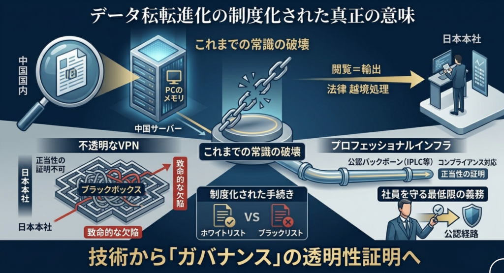 しかし、現在の規制が求めているのは「中身が見えるかどうか(技術的隠蔽)」ではなく、「その経路を誰が、どんな目的で提供し、移転先にどんな安全管理体制があるか(ガバナンスの透明性)」です。素性の知れない個人用VPNや、経由地が不明確な無料ツールは、その存在自体が「情報を不当に隠している」という疑いの対象になります。当局が求めているのは「隠すな、正当な理由を持って正当な道を通れ」という極めてシンプルな、しかし企業には重い要求なのです。