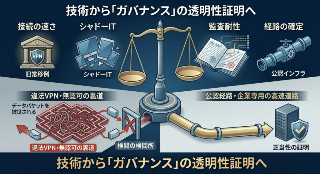 今、求められているのは、通信インフラを「個人の裁量」から「会社の統制下」へ引き戻すガバナンスの確立です。これまでのVPNは「壁を乗り越えるためのツール」でしたが、これからはビジネスの継続性を法規制の荒波から守り抜くための「公認インフラ」でなければなりません。