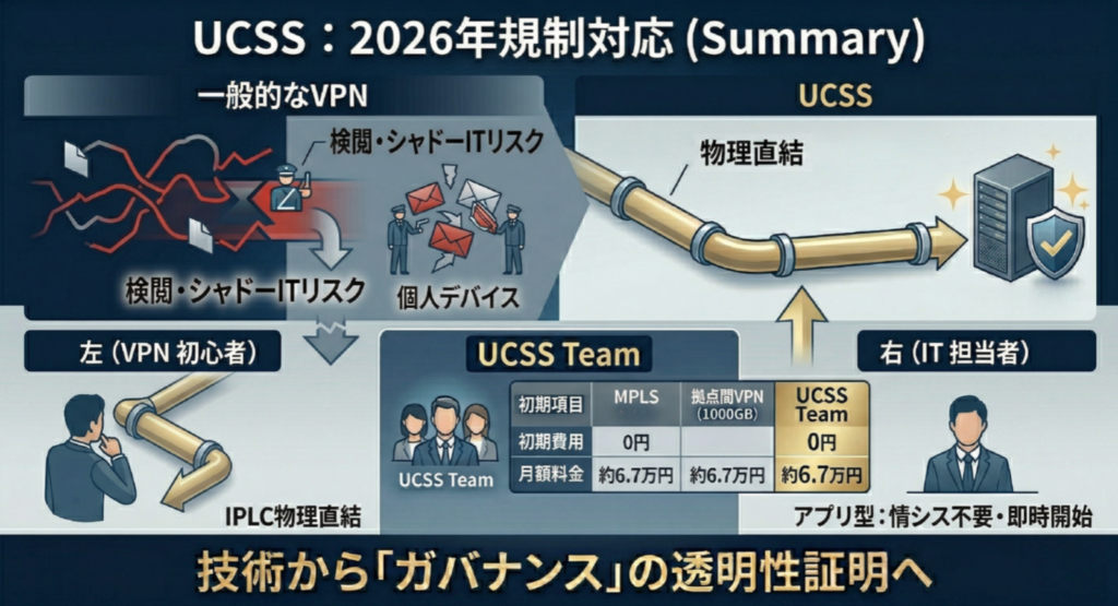 - UCSS Teamの緊急導入・全社展開: IPLC(専用線)による圧倒的な安定性と、監査にも耐えうるビジネス仕様のインフラを、まずは重要拠点から順次拡大してください。施行後の今だからこそ、その「差」が明確にわかります。