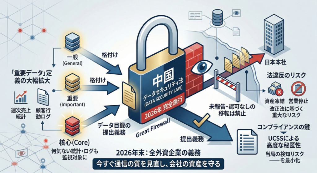 現場の担当者は、日本との日常的なメールやファイル共有ですら、「これは重要データに含まれるのではないか?」という不安に晒されています。この心理的ストレスが、中国ビジネスのスピード感を大きく削いでいるのが2026年の実情です。