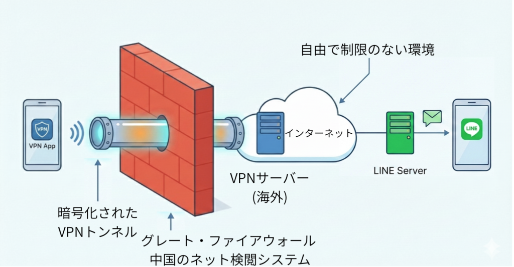 結論から言います。 VPNを使うと中国でもLINEが使えるのは、通信の「出口」を中国の外に移動できるからです。