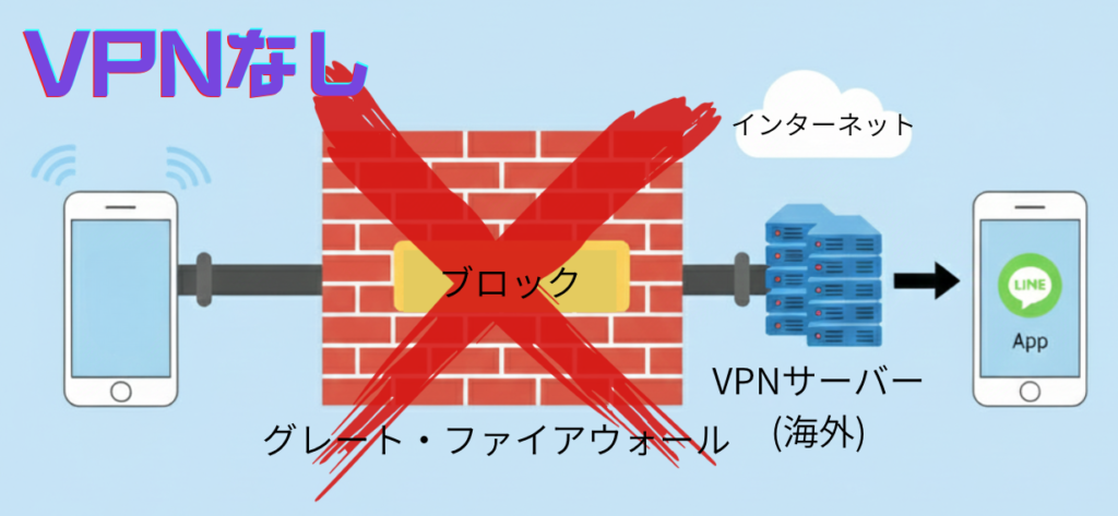 通常の通信では、 「スマホ → 中国国内の通信網 → 海外サーバー(LINE)」 という経路を通ります。