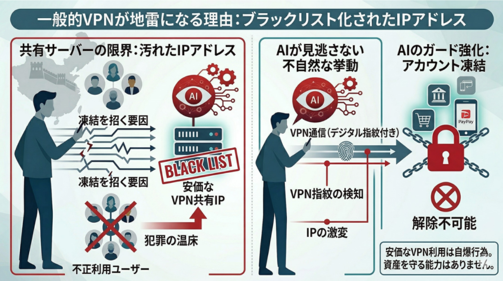 一般的なVPNが「地雷」になる理由|ブラックリストIPによる連帯責任のリスク