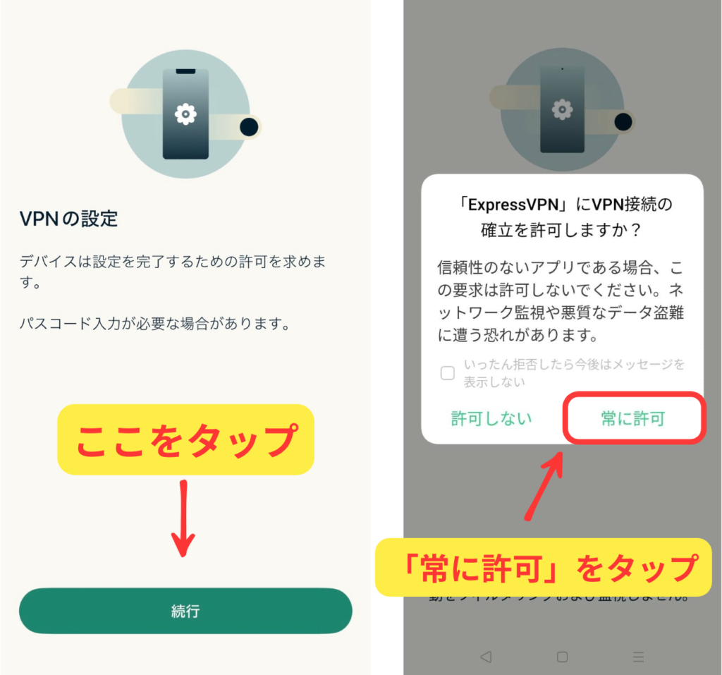 これも、Androidの通信をExpressVPNが保護するために必要な最後の手続きです。「許可」をクリックして進めてください。これを許可しないと、VPN接続が完了しません。
