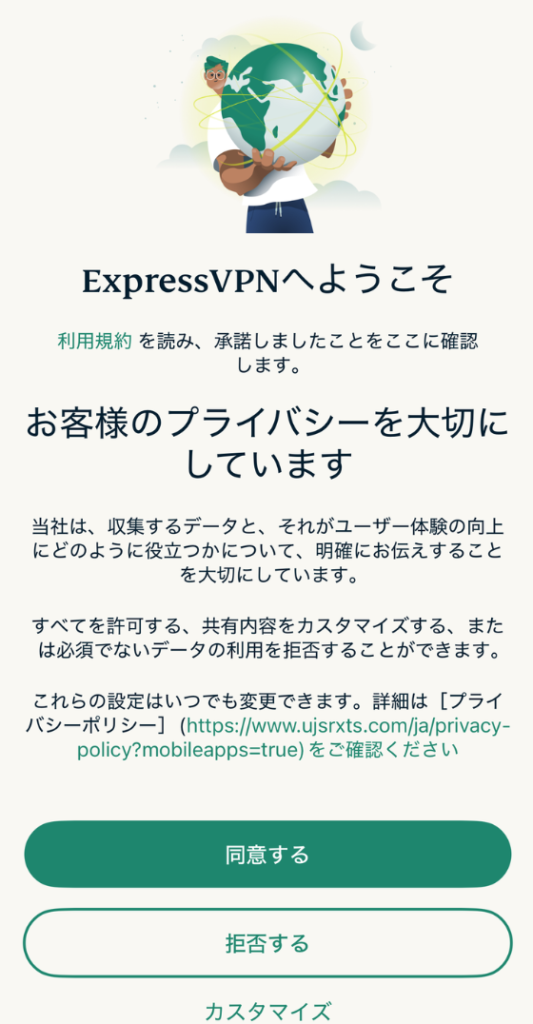 設定が完了し、初めて「接続ボタン(電源ボタン)」を押したとき、Androidから「“ExpressVPN”がVPN構成の追加を求めています」という確認画面が表示される場合があります。