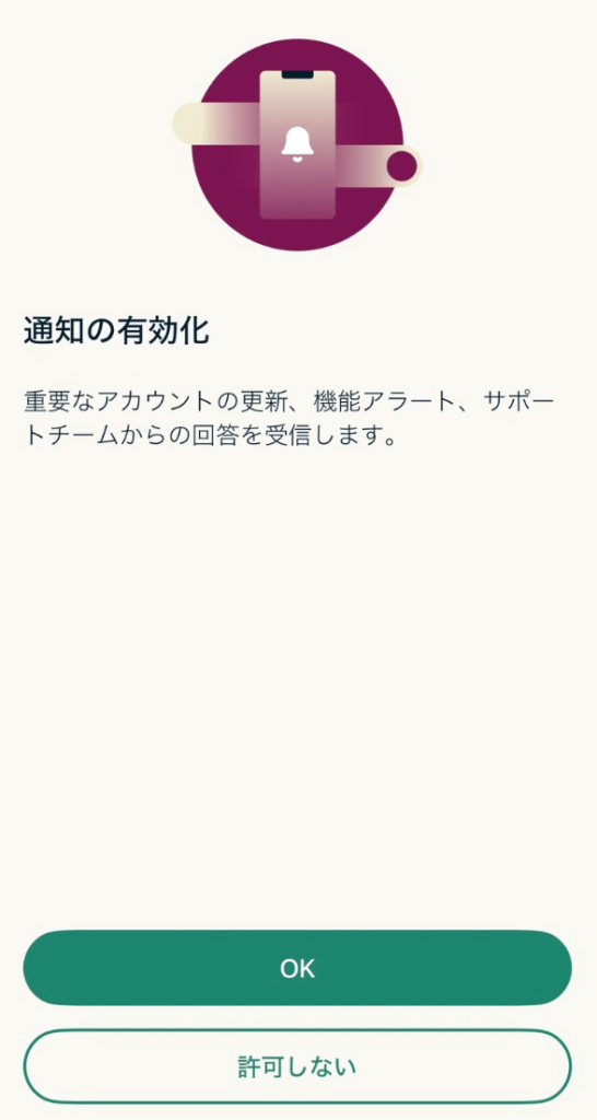 通知の許可が求められます。どちらでも構いませんが、煩わしいのが嫌な方は「許可しない」が良いと思います。