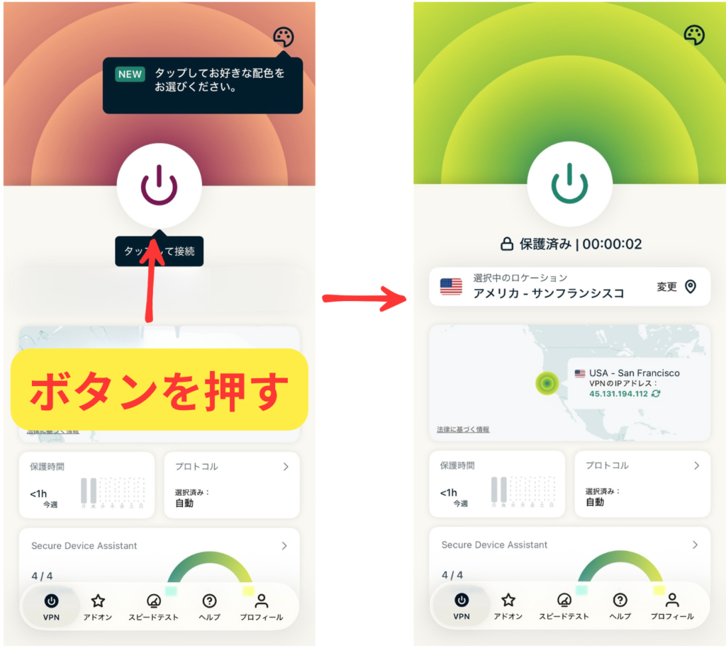 また、接続を解除したいときは、もう一度電源ボタンを押すだけ。VPNの仕組み上、接続中は速度が落ちることがあるため、使わないときは切断するのがおすすめです。