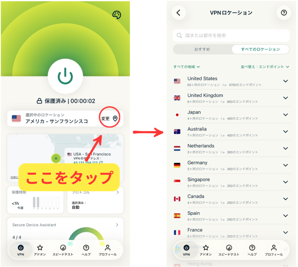 画像にある位置からロケーションを変更できます。それぞれの国から選ぶこともできますし、「おすすめ」のタブから最適なロケーションを選ぶこともできます。
