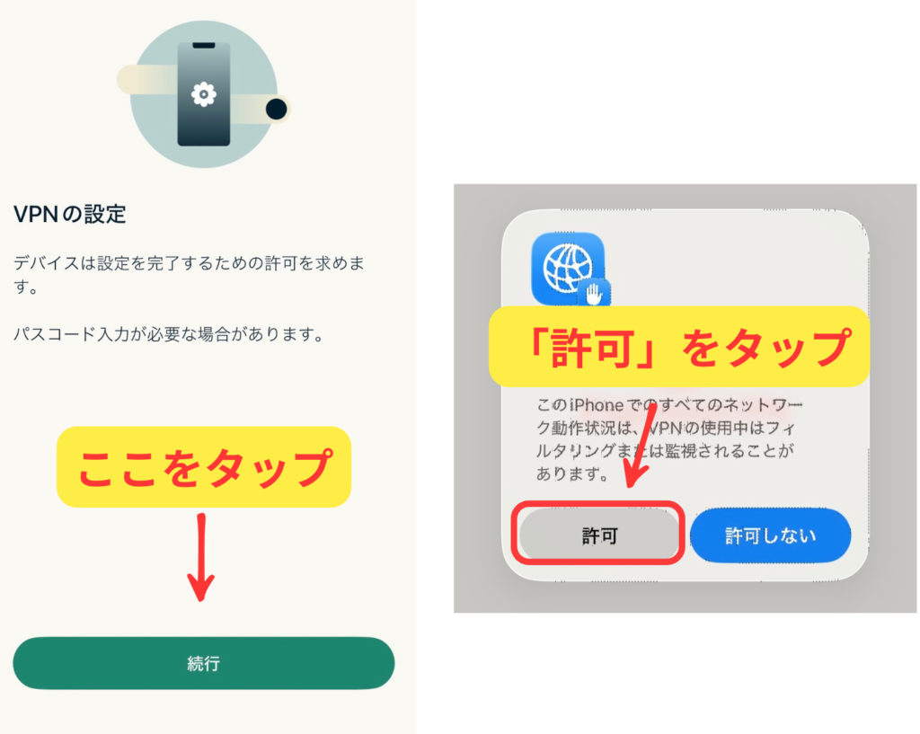 iPhoneはセキュリティが非常に高く、アプリが勝手に通信設定を変えられない仕組みになっています。そのため、持ち主であるあなたに「設定を変えてもいいですか?」と確認しているのです。自分でアプリを操作している時なら、安心して「許可」を押して進めて大丈夫です。