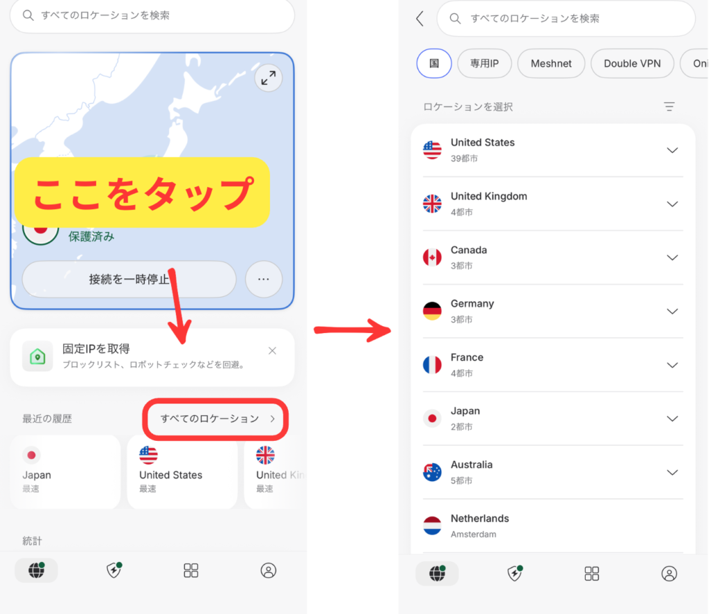 画像にある位置からロケーションを変更できます。それぞれの国から選ぶこともできますし、「おすすめ」のタブから最適なロケーションを選ぶこともできます。
