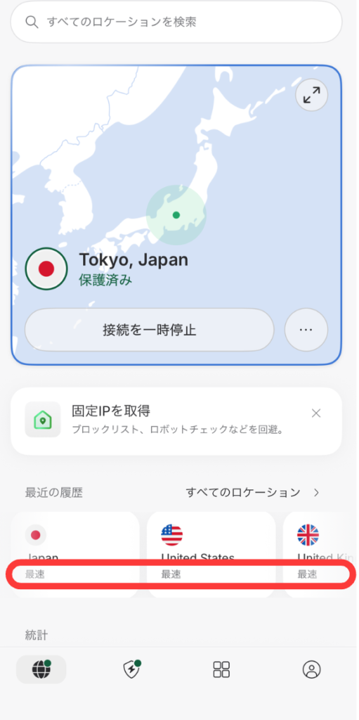 または、トップ画面の下方におすすめが表示されています。それぞれのロケーションの下の方に「最速」と書かれています。右の方にスワイプしていくと、他の国の最速のロケーションが出ていますので、こちらから選ぶと楽なのでおすすめです。