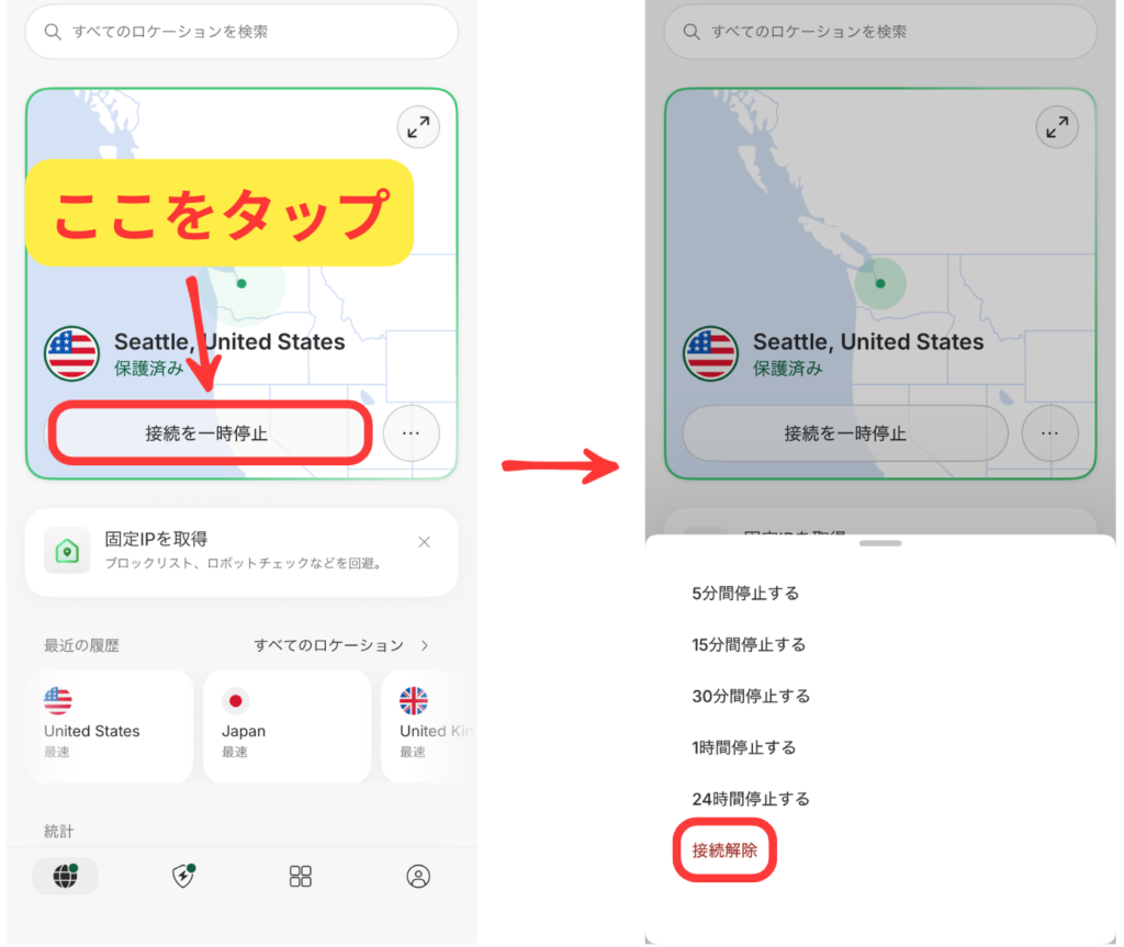 VPNの仕組み上、接続中は速度が落ちることがあるため、使わないときは切断するのがおすすめです。