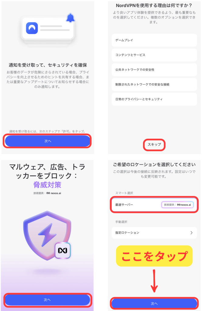 基本的には画面に沿って進めていきます。「最後のご希望のロケーションを選択してください」のところは、すでに選択されている「最速サーバー」で構いません。