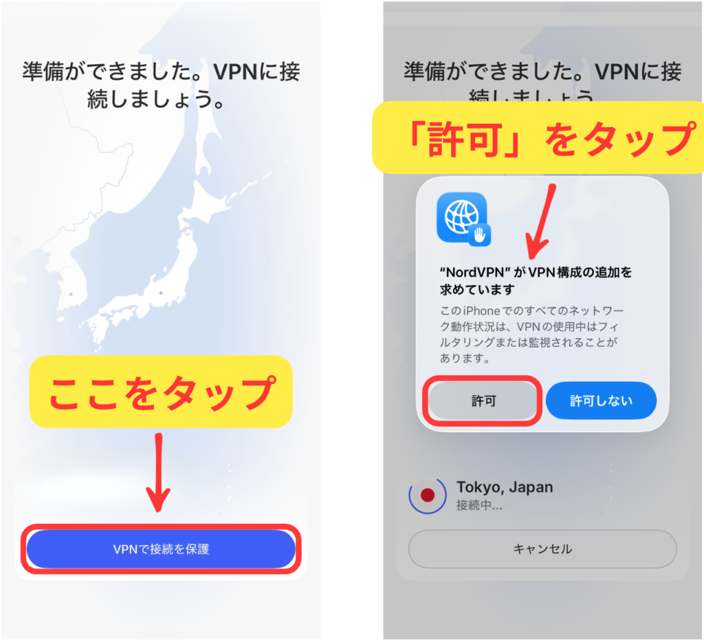 これも、iOSの通信をNordVPNが保護するために必要な最後の手続きです。「許可」をクリックして進めてください。これを許可しないと、VPN接続が完了しません。