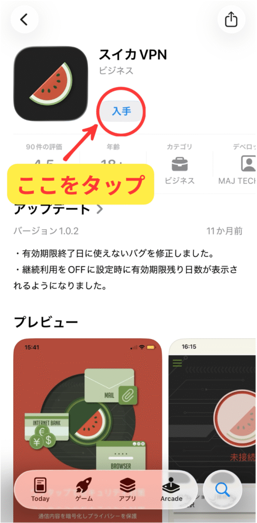 App Storeで「スイカVPN」と検索し、公式アプリをインストールします。