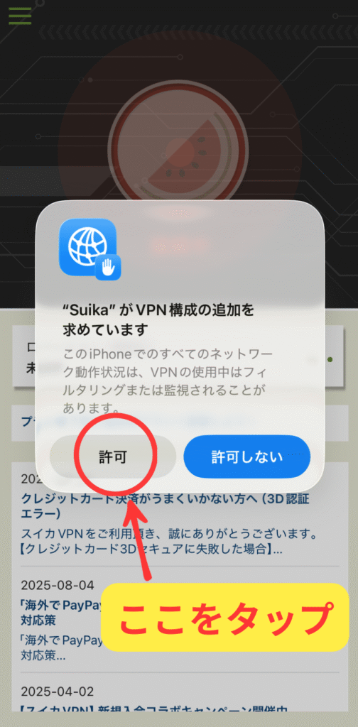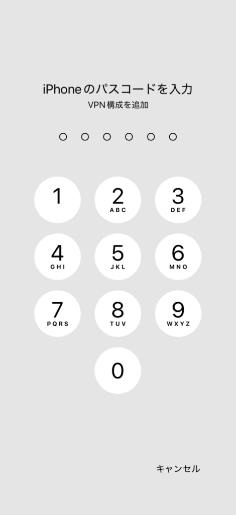 VPN構成の追加ダイアログが出た場合は「許可」を押し、iPhoneのパスコードを入力します。