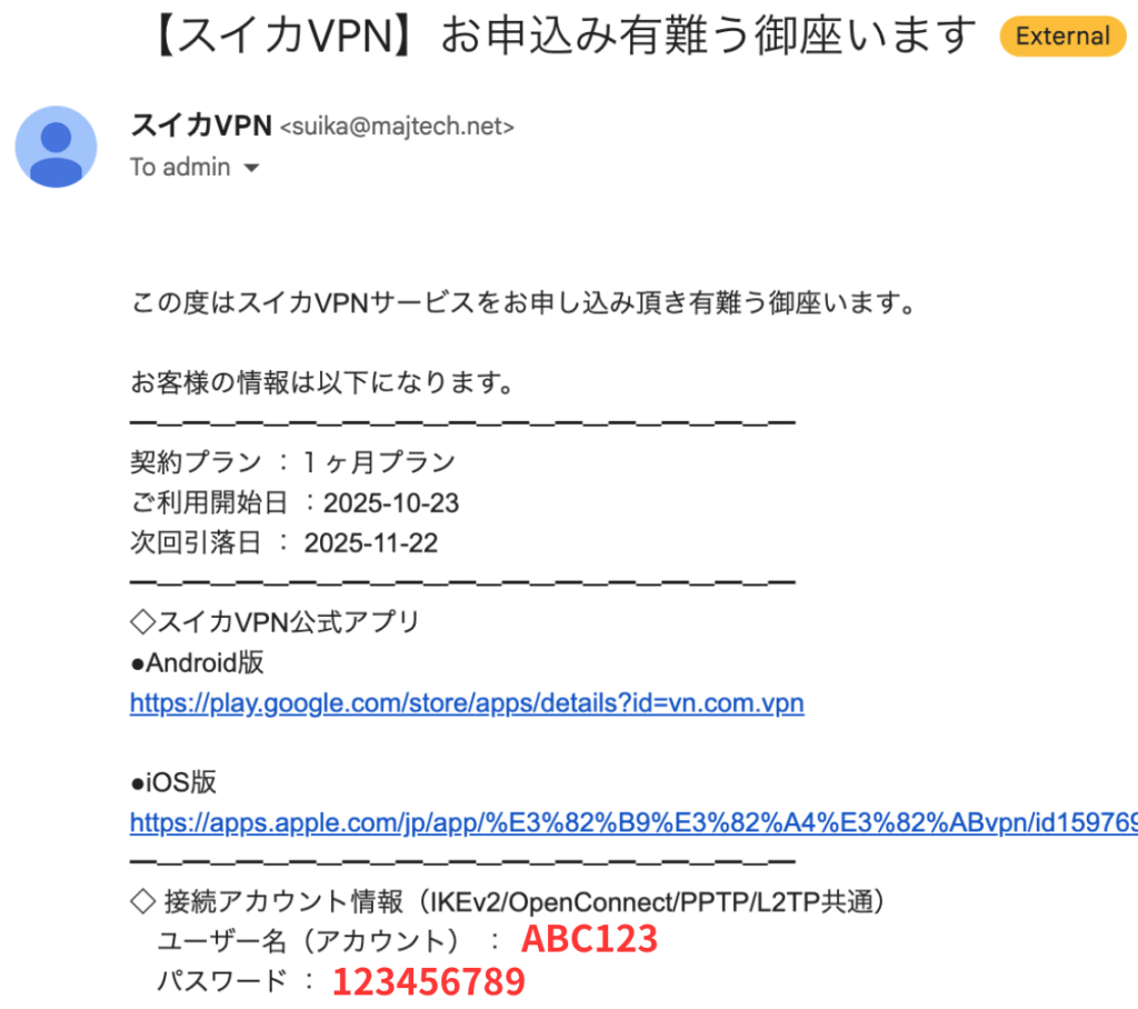 スイカVPNを購入済みの方は、「申し込み有難う御座います」というメールに記載されているユーザー名とパスワードを確認します。