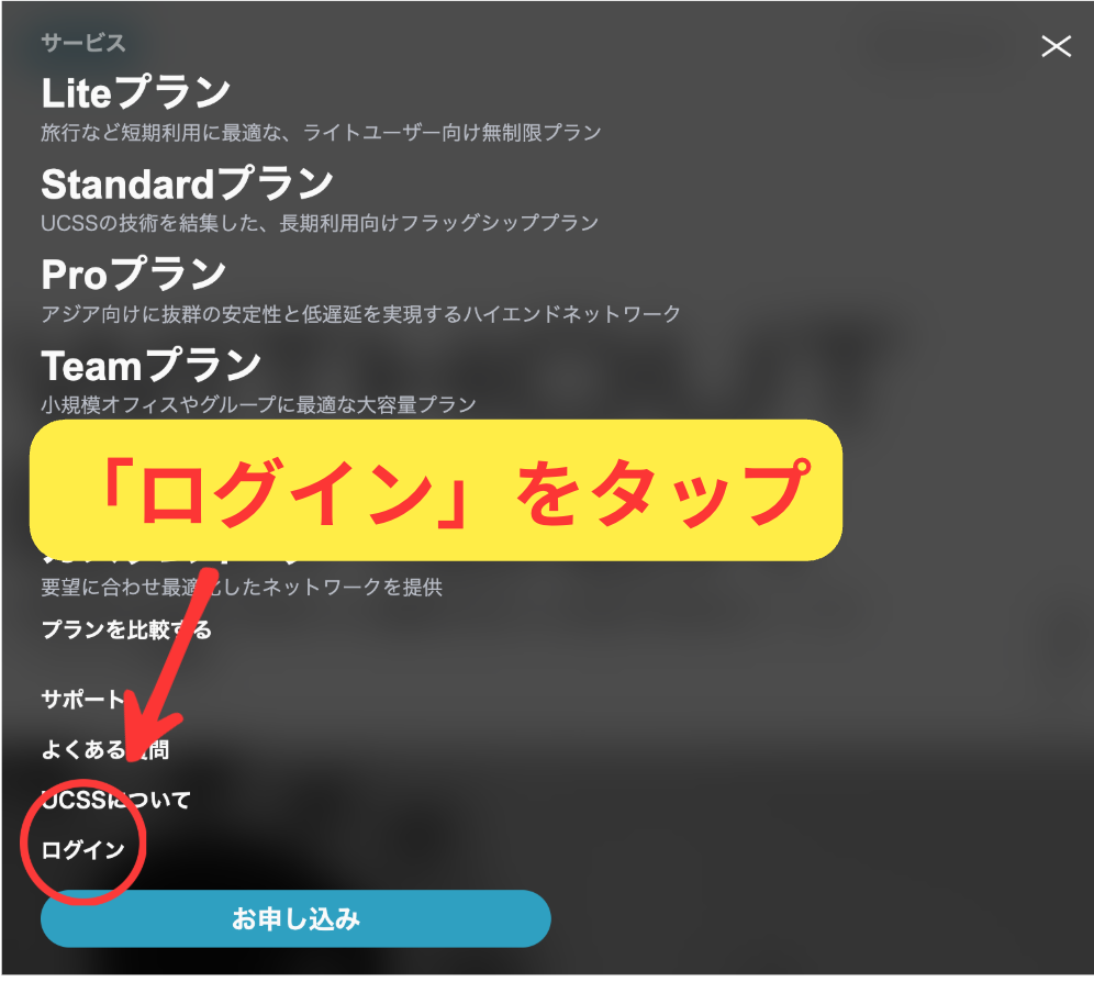 メニューが開いたら、一番下のログインをクリックします