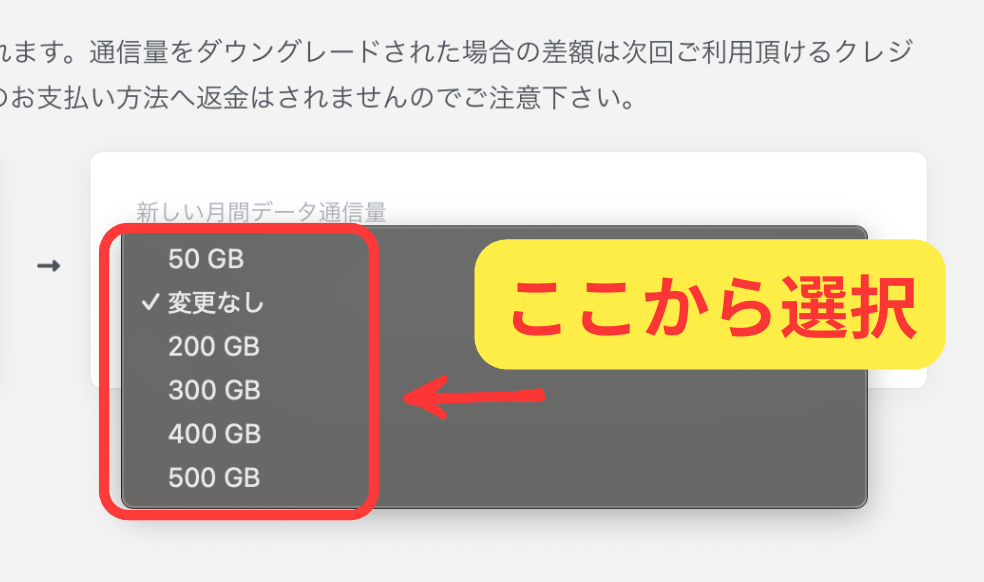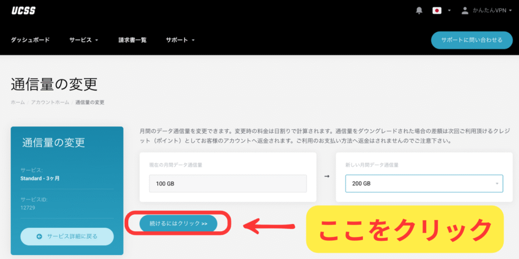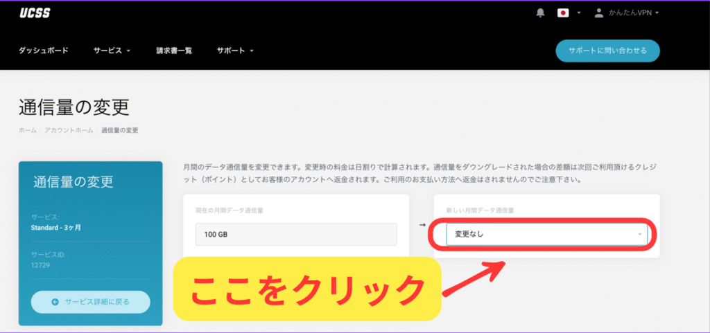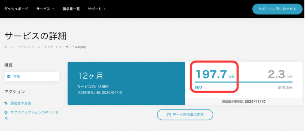 サービスの詳細の画面の左か下にある通信量の変更をクリックします