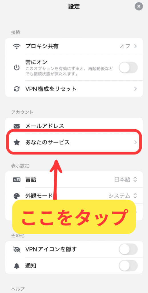 設定のページが開いたら、あなたのサービスをタップします