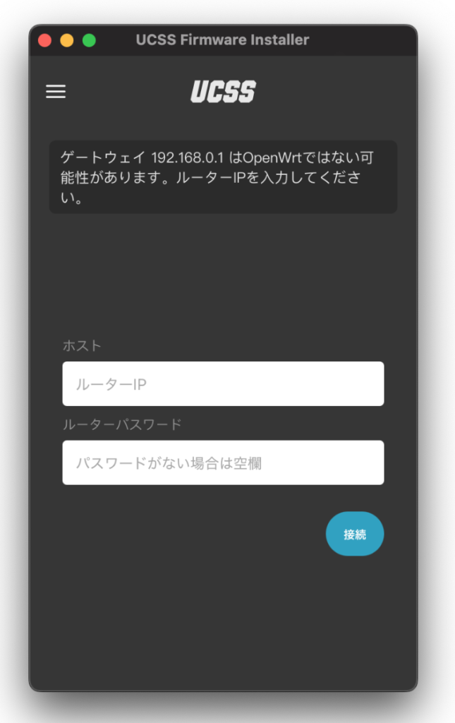IPは自動で入力されます。ルーターのパスワードを入力し、次の画面で、UCSSに登録しているメールアドレスとパスワードを入力します。その後プランを選択して設定完了です。