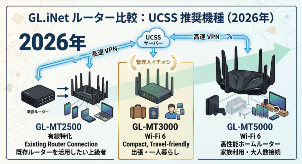 2026年現在、UCSSが公式に推奨・サポートしている主要なGL.iNet社製ルーターは以下の3機種です。これら以外のモデルで、過去の「ファームウェア書き換え手法」を使って設定しようとすることは、今後サポートされない可能性が極めて高いため、絶対にやめてください。