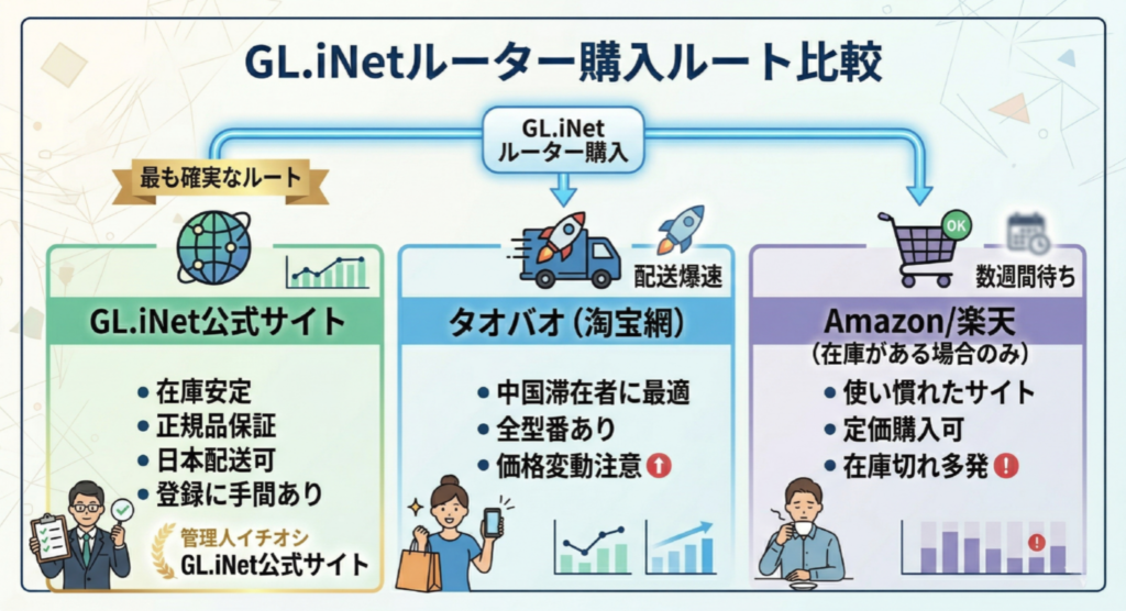 - GL.iNet公式サイト: 最も確実なルートです。海外サイトなので登録に少し手間を感じるかもしれませんが、在庫は安定しており、偽物を掴むリスクもありません。日本への配送も問題なく行われます。