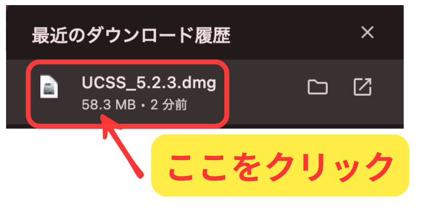 ダウンロードしたファイルを開きます。管理人はGoogle Chromeを使っているので、ダウンロード履歴から開いています。ダウンロードのフォルダからも同じ操作になります。