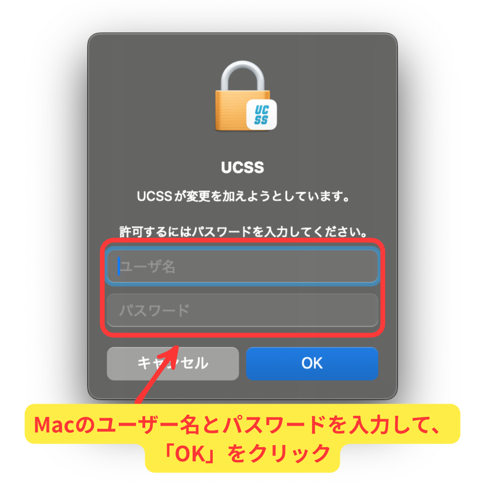 変更の許可を求められます。Macのユーザー名とパスワードを入力します。