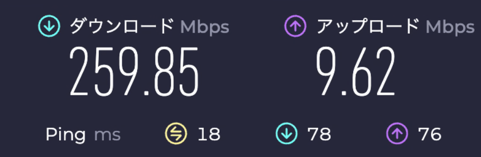 ダウンロード 259.85Mbps、アップロード 9.62Mbps、Ping 18ms