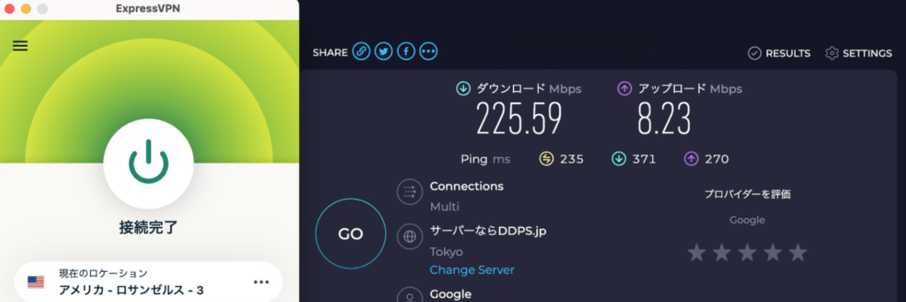 VPNなし/ExpressVPNオン(日本・渋谷)/ExpressVPNオン(アメリカ・ロサンゼルス)の3パターンを比較しました。