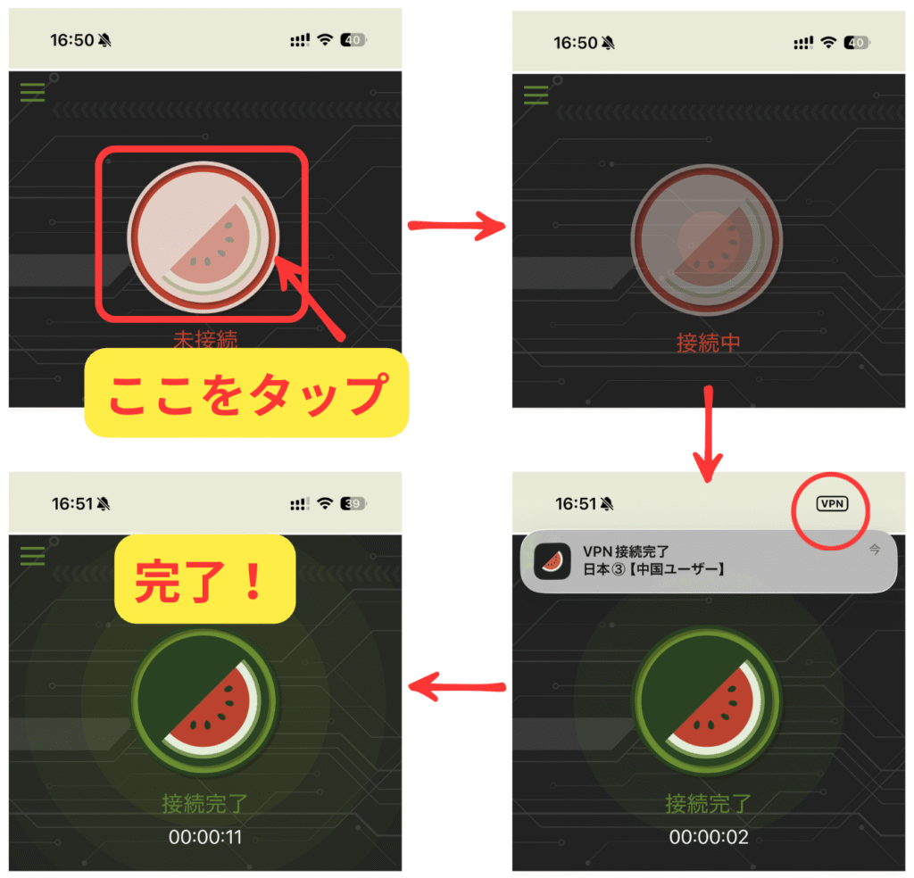 でもスイカVPNは、アプリを開いて“接続”ボタンを押すだけ。