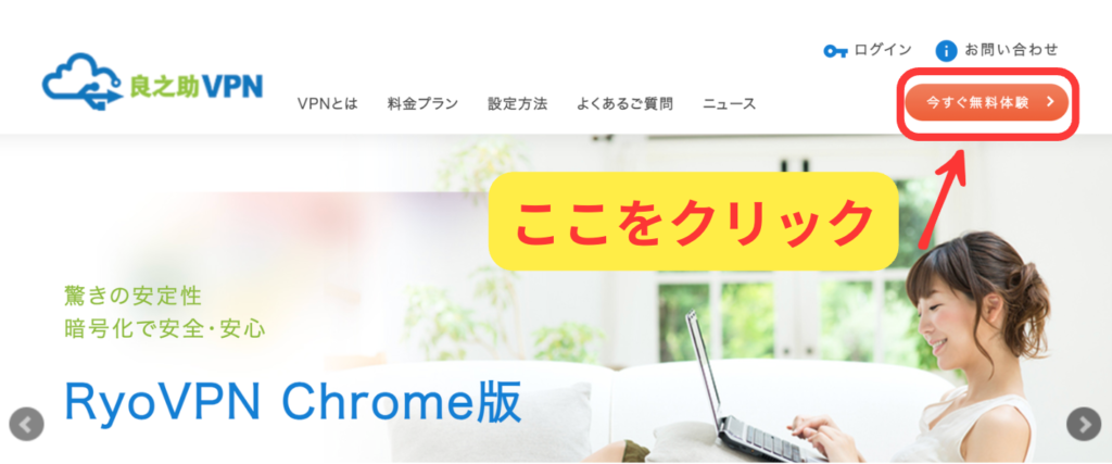 まずは、良之助VPNの公式サイトにアクセスします。 トップページに表示されている「無料体験」または「お申し込み」ボタンをクリックしてください。