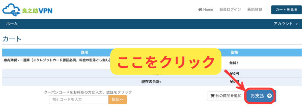 次に、カート画面で料金を確認し、「お支払い」へ進みます。