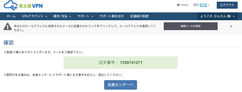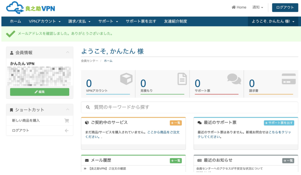 申し込み完了後、良之助VPNから登録完了メールが届きます。 このメールには、以下の情報が含まれています。