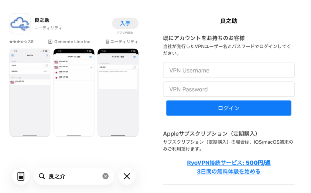 iPhone・iPadの場合はApp Store、 Android端末の場合はGoogle Playを開き、「RyoVPN」または「良之助」と検索してください。